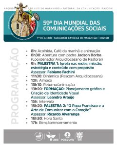 No próximo dia 1º de junho, das 8h às 17h, a Faculdade Católica do Maranhão, no Centro de São Luís, será o ponto de encontro de comunicadores católicos de toda a Arquidiocese. É quando acontece o Encontro do 59º Dia Mundial das Comunicações Sociais (DMCS), promovido pela Comissão Arquidiocesana da Pastoral da Comunicação (Pascom) da Arquidiocese de São Luís.
