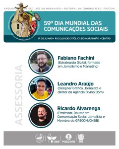 A programação está imperdível, e quem confirma isso são os nomes que o evento está trazendo: três grandes profissionais da Comunicação – com reconhecida trajetória no cenário católico e secular – que vêm de diferentes regiões do Brasil para compartilhar seus saberes e fortalecer a missão evangelizadora por meio da comunicação.